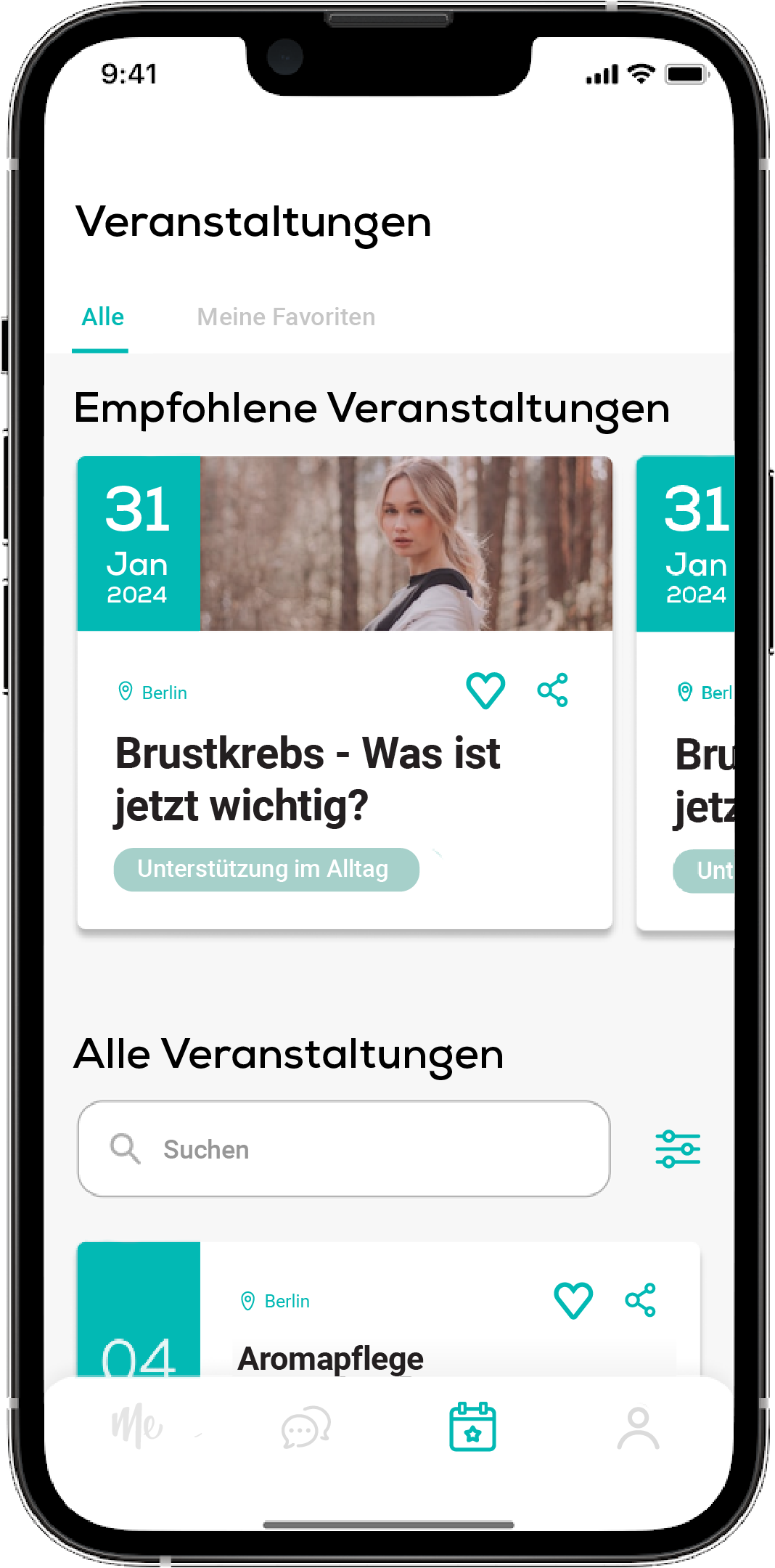 Krankenhäuser, Praxen, Zentren und Patientenorganisationen haben die Möglichkeit ihre Patientenfortbildungen im Focus Me-Veranstaltungskalender anzuzeigen, um ihre Patientinnen dazu einzuladen und zu informieren. Medizinische Fachpersonen können die Chatfunktion zum Austausch mit Patientinnen nutzen, wenn der Einsatz im jeweiligen Zentrum oder in der Praxis gewünscht ist.